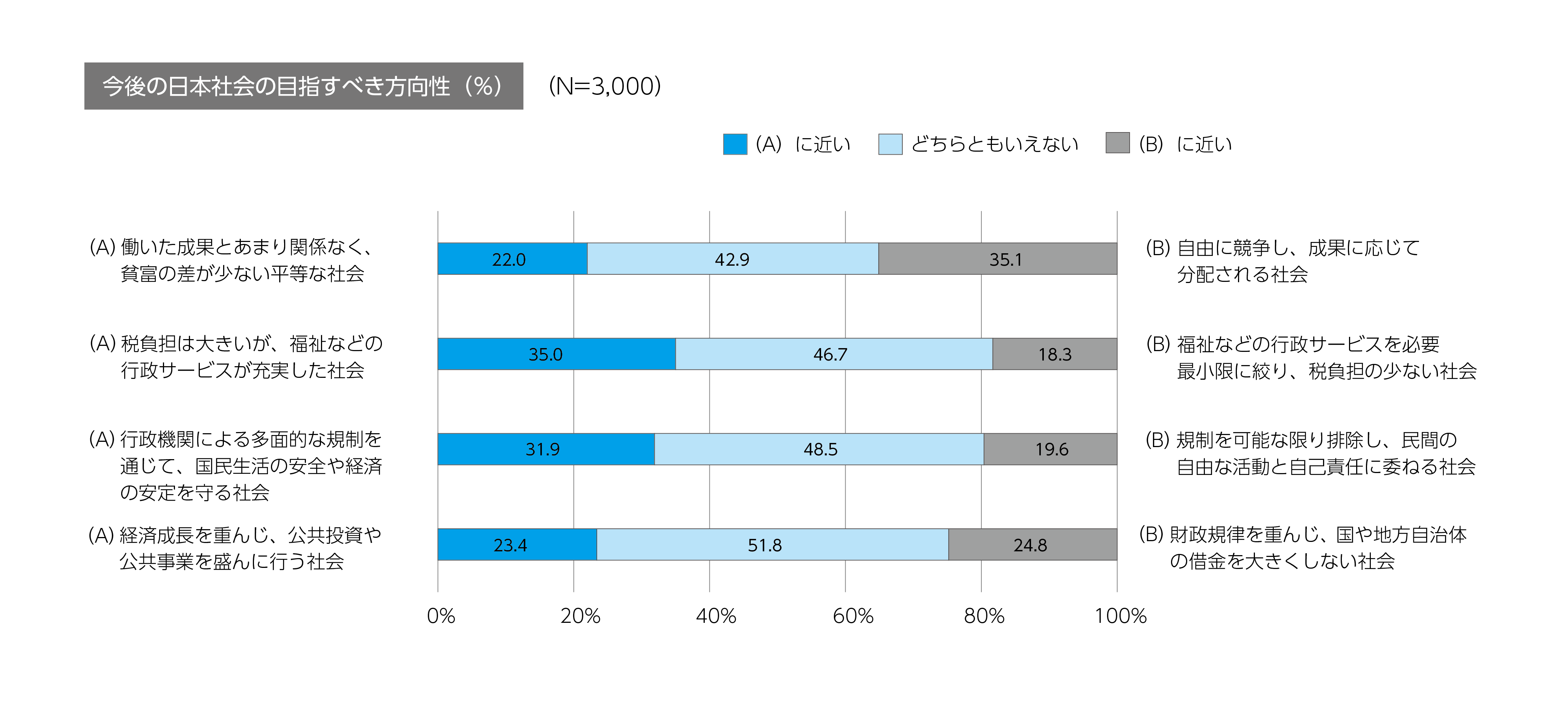 世界価値観調査では郵送法、本調査ではインターネット調査と、手法が異なり、回答者のタイプが違う可能性があるので、直接的な比較は難しいのですが、「どちらともいえない」という回答が多いということは、やはり日本社会の目指すべき方向性について今は考えがまとまらない、ということでしょうね。 ただ興味深いのは、「自由に競争し、成果に応じて分配される社会」「財政規律を重んじ、国や地方自治体の借金を大きくしない社会」を望むという自由・自律主義志向が強い一方、「税負担は大きいが、福祉などの行政サービスが充実した社会」「行政機関による多面的な規制を通じて、国民生活の安全や経済の安定を守る社会」という逆の志向、すなわち福祉国家志向も見られたことです。今後はミクロの分析も継続実施していきたいと思います。
