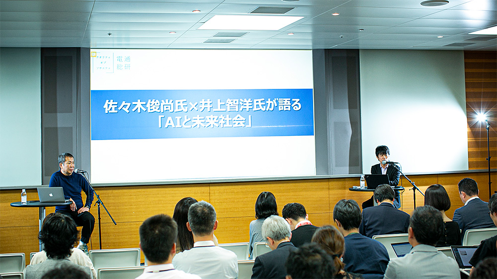2019年10月29日、電通本社ビルで第1回電通総研セミナーを開催しました。登壇いただいたのは作家・ジャーナリストの佐々木俊尚氏と、近著『純粋機械化経済』が注目を集める経済学者の井上智洋氏。AI(人工知能)は人間の雇用を奪うのか、経済活動をどう変えるのかなど、AIがもたらす未来について語りました。