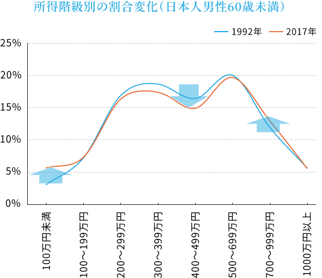 そしてそれは日本でも例外ではなく、日本人男性の所得を表すグラフ(下図青線)は、中間所得層の山が失われたフタコブラクダのような形をしています。今後、このコブとコブの間の谷はさらに深くなり、低所得層がさらに増えていくはずです。