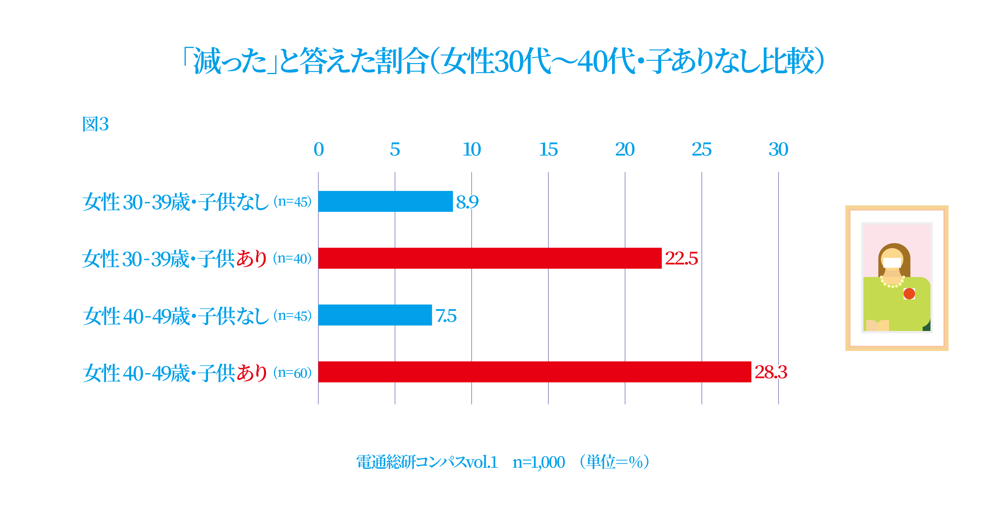 5月の「STAY HOME 週間」では、多くの人が大型連休を自分の家で過ごしたことが調査結果からも明らかとなりました。そんななか、「STAY HOME 週間」において「外出自粛要請などを受けて、それ以前と比べて、あなたの時間に余裕は増えましたか」ときいたところ、全年代で「増えた」あるいは「変わらない」が多い結果となりました。一方で「減った」と答えた人に注目してみると、女性の30代・40代で、男性や女性の他年代と比べてその割合が多くなりました(図2)。また、女性30代・40代のなかでも子供の有無で大きく差があり(図3)、一斉休校と大型連休の外出自粛によって、母親の負担が増えたことがうかがえます。
