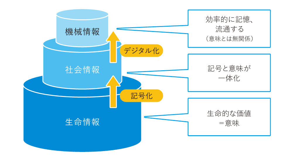 「生命情報」から発して、それが「社会情報」になって、さらにデジタル化して効率よく伝わる「機械情報」となる三層構造をきちんと踏まえていないと、デジタル社会で私たちは機械のごとく扱われてしまうでしょう。これが、私が「生命情報」と言い出した理由です。結局、生命体にとって価値があるのは自分にとっての意味。これは記号論でいう記号内容つまり辞書的な意味ではありません。「生命情報」は「本来の意味」で、感情や身体的なものと結びついているのです。
