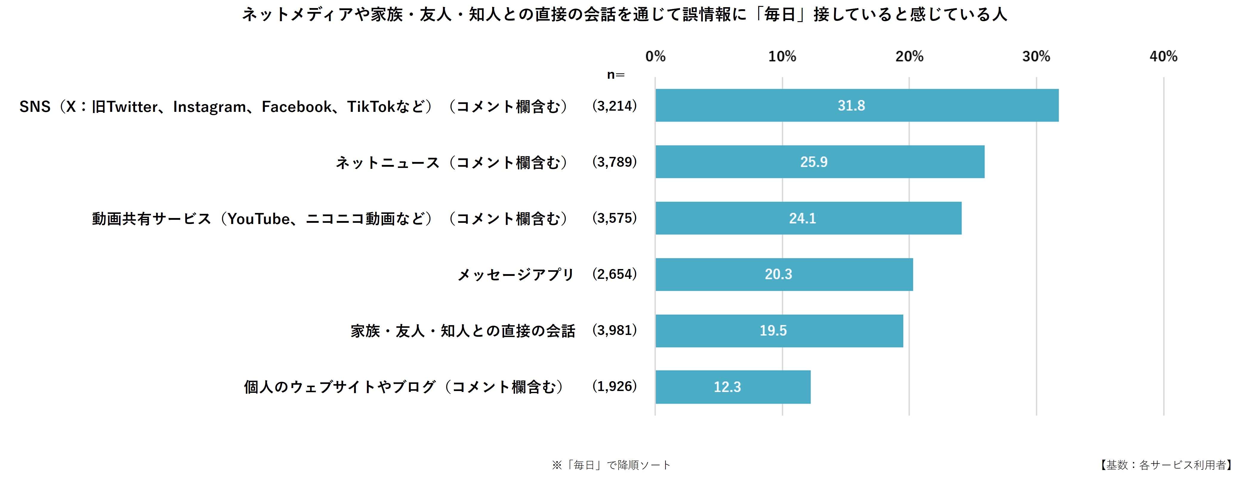 さまざまなメディアを挙げて、誤った情報・ニュースを見聞きする頻度をメディアごとに回答してもらった結果、誤った情報・ニュースを「毎日」見聞きすると回答した人の割合は、SNSで31.8%、ネットニュースで25.8%、動画共有サービスで24.1%に上りました。これらは回答者の感覚であり、必ずしも事実を示すものではありませんが、一定数の人が、日々、誤情報に接していると感じていることを示唆しています。