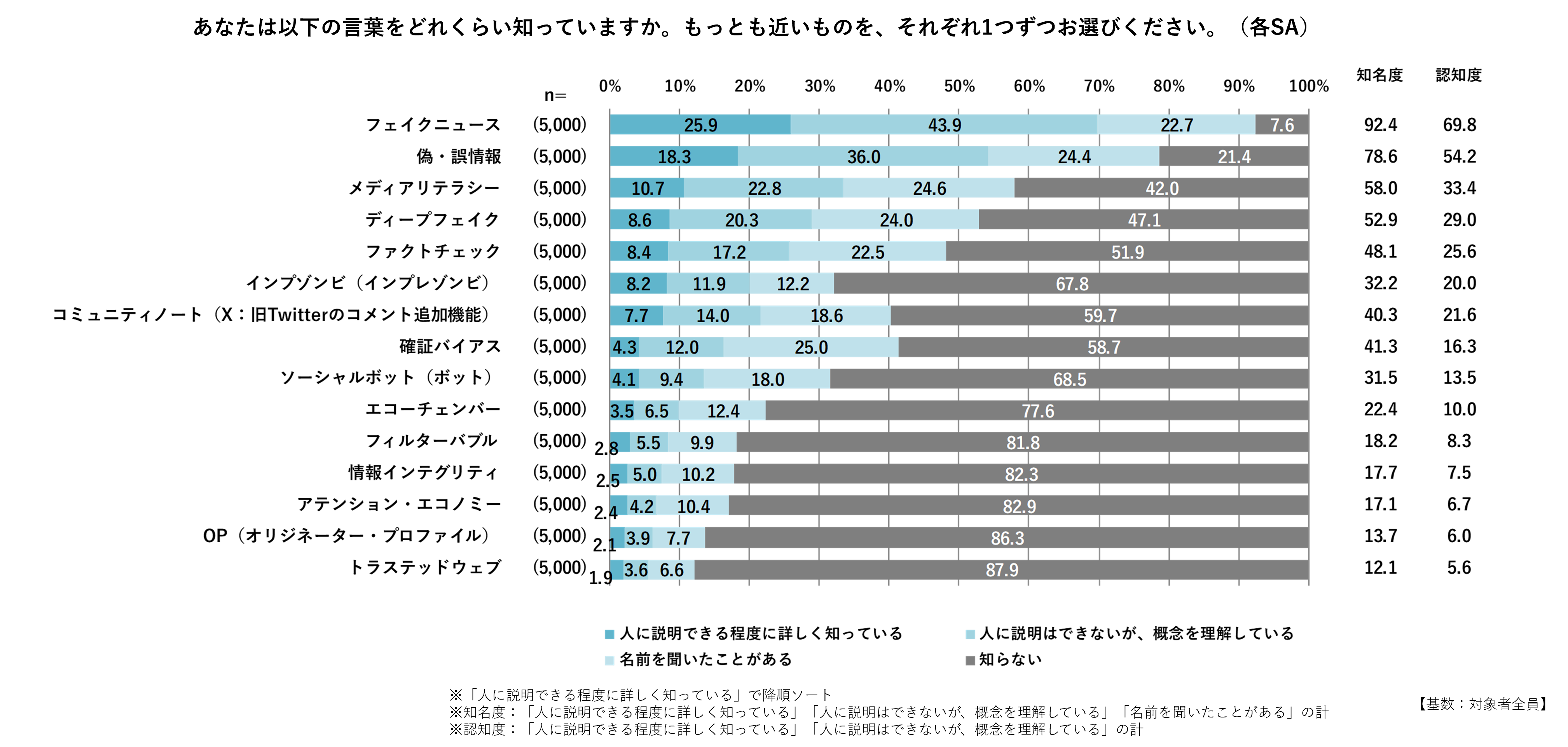 情報インテグリティを考える上で欠かせないさまざまな用語について、本調査では認知の程度を尋ねました。「フェイクニュース」という用語の認知(「人に説明できる程度に詳しく知っている」「人には説明できないが、概念を理解している」の計)は約7割、「名前を聞いたことがある」まで含めると9割となり、広く知られていることがわかりました。