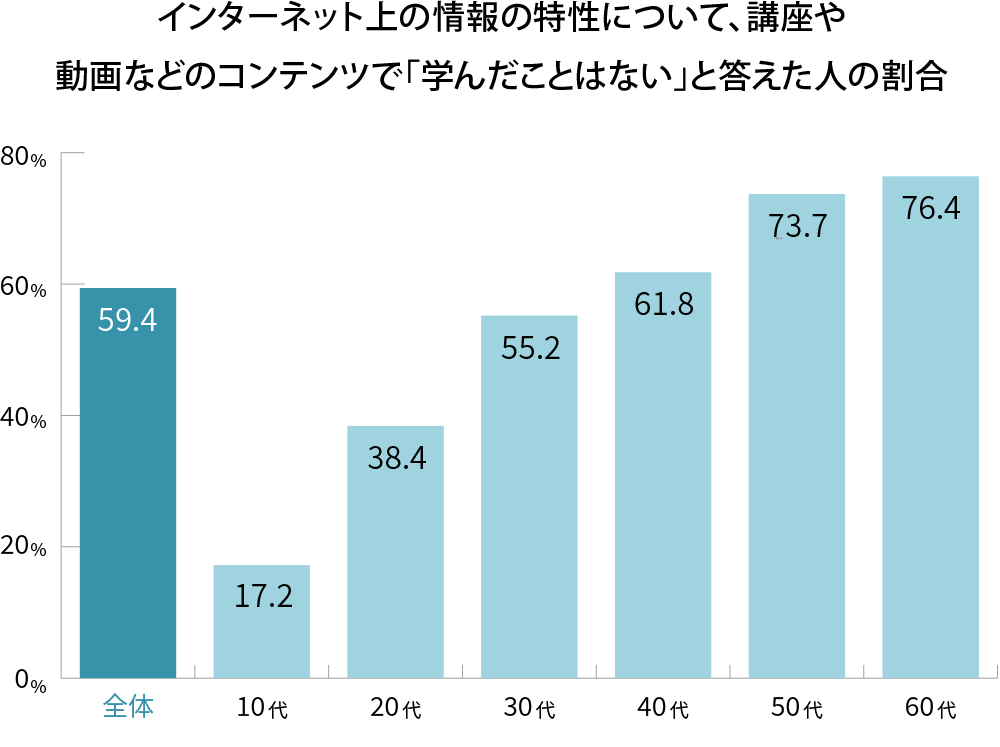 インターネット上の情報の特性に関して学んだことがあるかを尋ねる質問では、特に中高年層が「学んだことはない」と回答した方が多いという結果でした。私も含めた中高年層の多くは学校教育で情報リテラシーについて学んでおらず、どんなリスクがあるのかもわからないままインターネットを使用している状況を反映しているのではないかと思います。今後どのようにメディア・リテラシー教育を普及させていくのがよいと思いますか?
