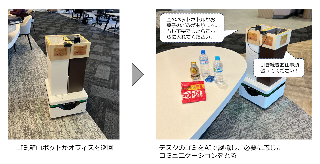 - コミュニケーションゴミ箱ロボット:デスク上のゴミをAIで認識し、状況に応じてゴミ捨てを促すなど、従業員とコミュニケーションを取るロボット(図2)