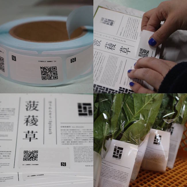 本日の作業はパッケージごとに異なるQRコードとNFCタグを付けること。これだけ野菜に囲まれたのは人生初。